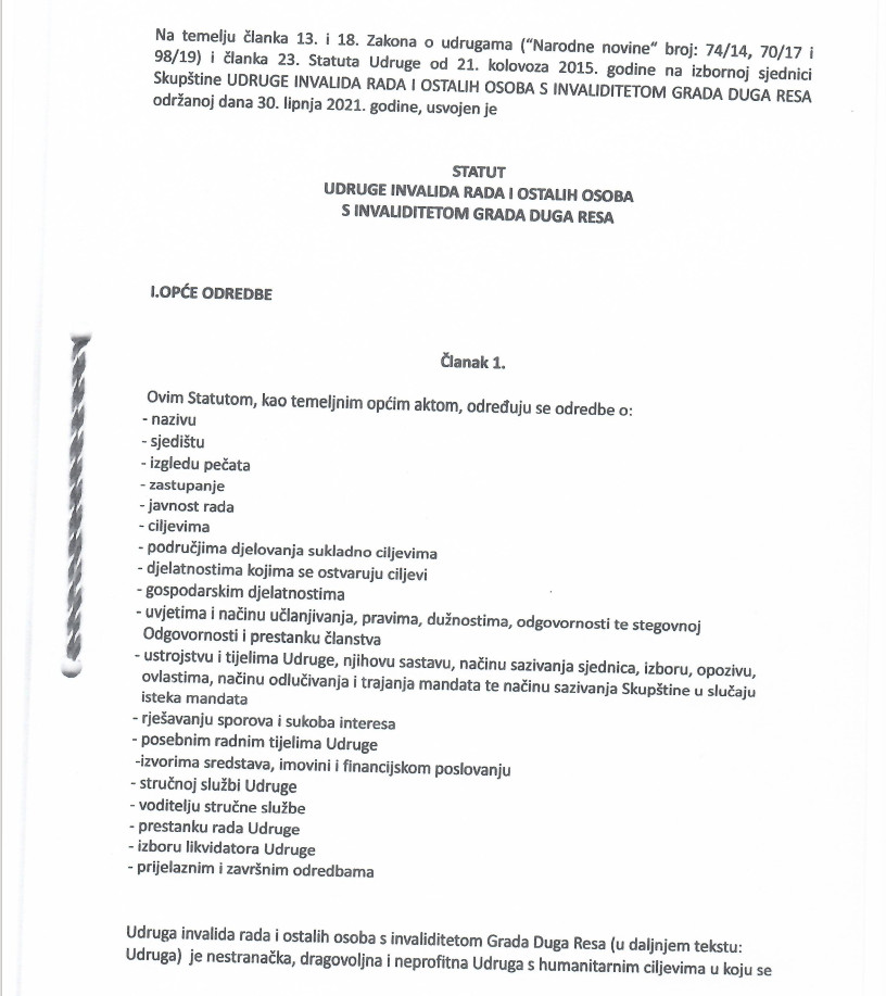Na izbornoj sjednici Skupštine Udruge invalida rada i ostalih osoba s invaliditetom grada Duga Rese, održanoj 30. lipnja 2021. godine, usvojen je novi Statut Udruge.
